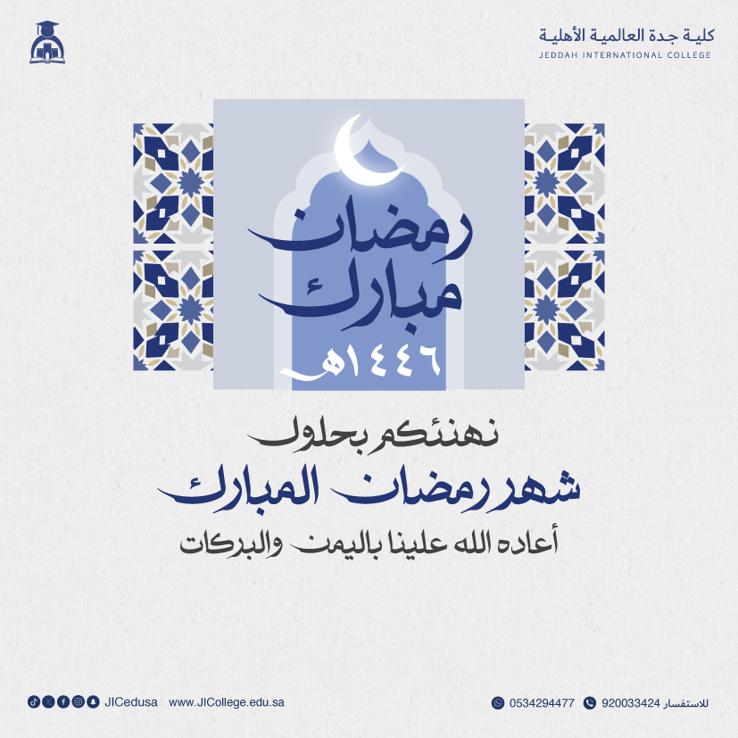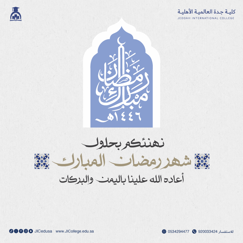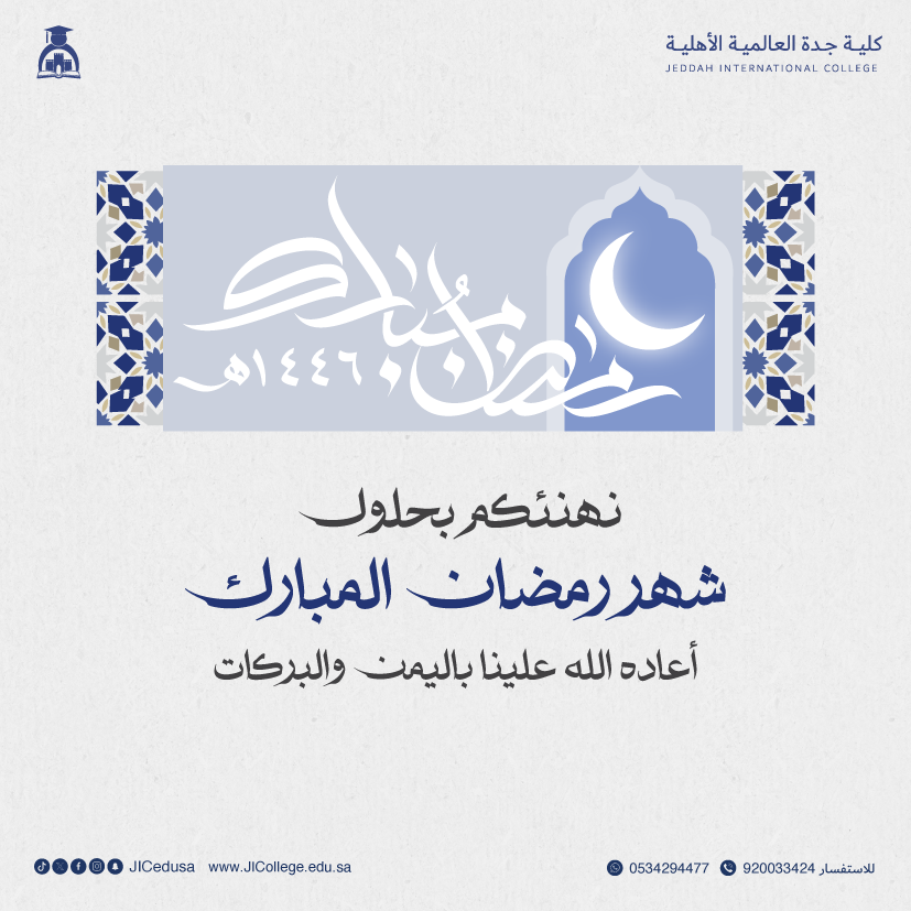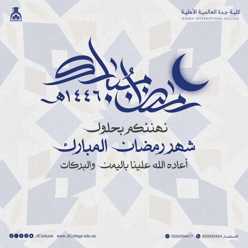 تهنئكم كلية جدة العالمية بحلول شهر رمضان الكريم , أعاده الله علينا وعليكم باليمن والبركات